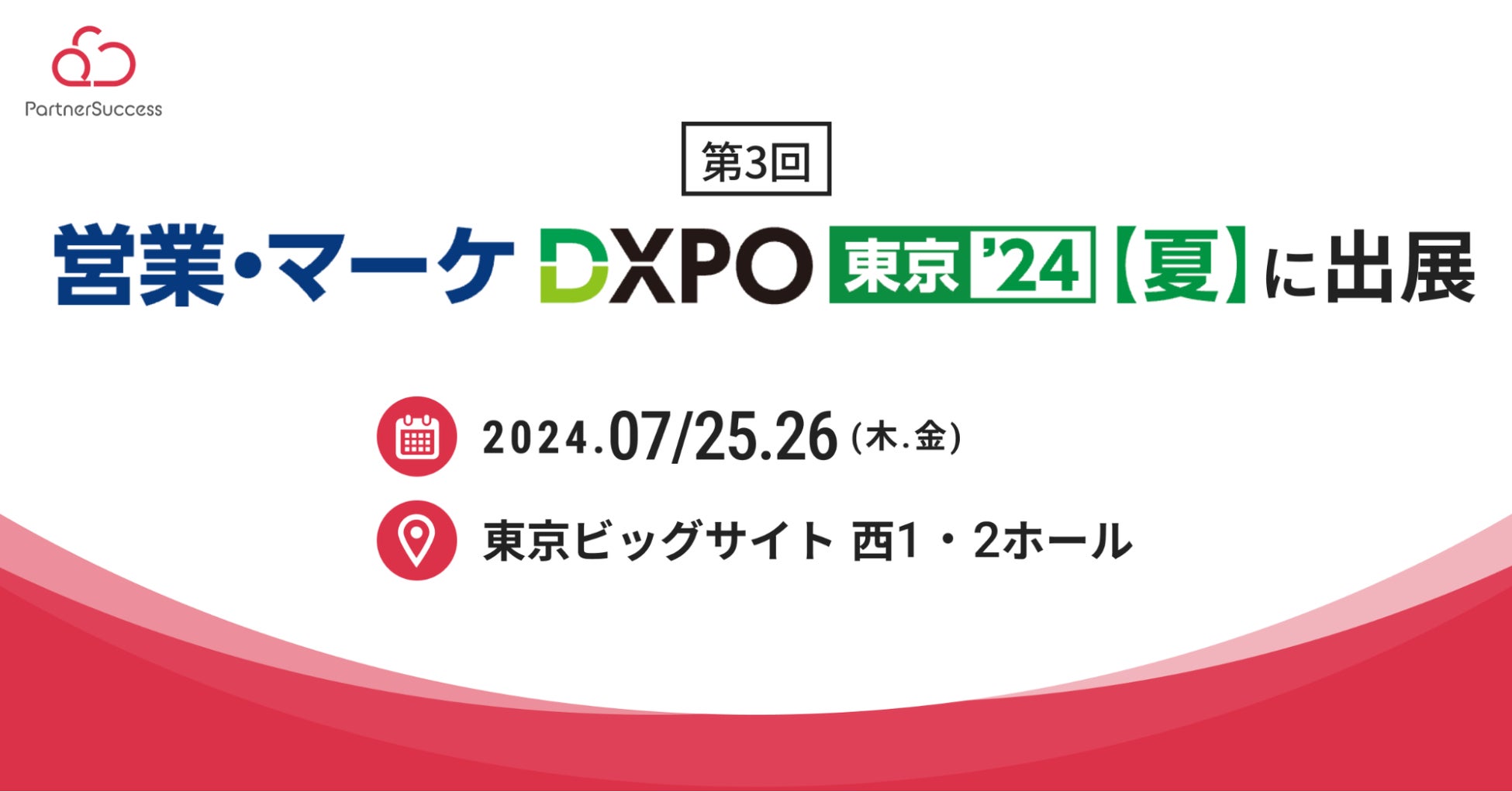 代理店販売で収益を最大化するPRM(※1)-代理店連携管理クラウド「PartnerSuccess」を開発運営するパートナーサクセス株式会社(本社:東京都港区、代表取締役 永田雅裕、以下「パートナーサクセス」)は、第3回 「営業・マーケDXPO 東京’24【夏】」に出展いたします。