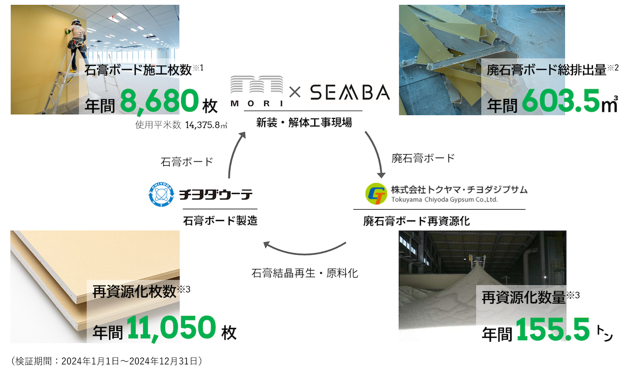 株式会社船場(本社:東京都港区、代表取締役社長:小田切潤)は、森ビル株式会社(東京都港区、代表取締役社長 辻󠄀慎吾)、チヨダウーテ株式会社(本社:三重県四日市市、代表取締役社長:平田芳久)および、株式会社トクヤマ・チヨダジプサム(本社:三重県三重郡川越町、代表取締役社長:加藤弘義)と、資源循環型都市の実現に向けて2024年1月1日から1年間、建築物の壁や天井の内装材などに使用される石膏ボードの水平リサイクルプロジェクト“ボードtoボード”の共同実証実験を実施しました。その結果、森ビル開発施設における石膏ボードの循環量・CO₂削減量を定量化しました。新装・解体工事現場での丁寧な分別により、603.5㎥の廃石膏ボードを回収し再資源化。その原料から新たに11,050枚(*3)の石膏ボードの製造に成功しました。