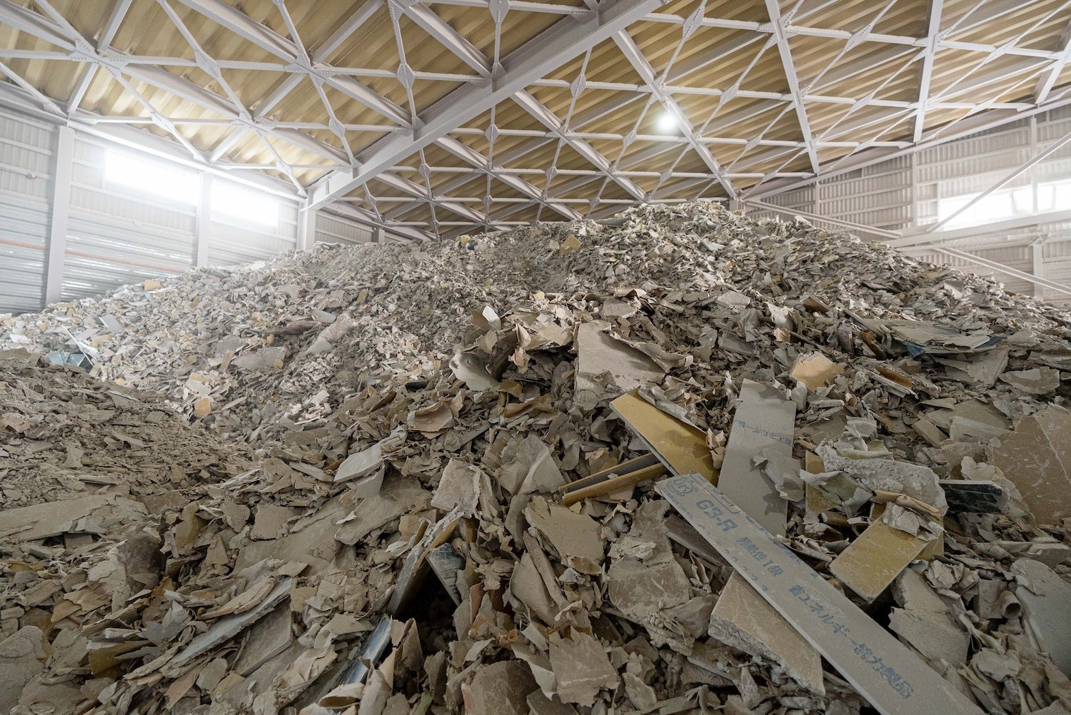内装工事に欠かせない石膏ボードの日本全国における廃棄量は、2047年には300万トンを超えると推定される一方、リサイクル率が低く、管理型最終処分場の逼迫が懸念されています(*5)。また、国内で副産される石膏原料は減少しており、現在では年間約200万トン以上もの天然石膏を海外からの輸入に依存しています。この点について、安定供給に対する懸念および天然資源の保全の観点からも課題となっており、天然石膏に依存しない、廃石膏ボードの再利用化が求められています。