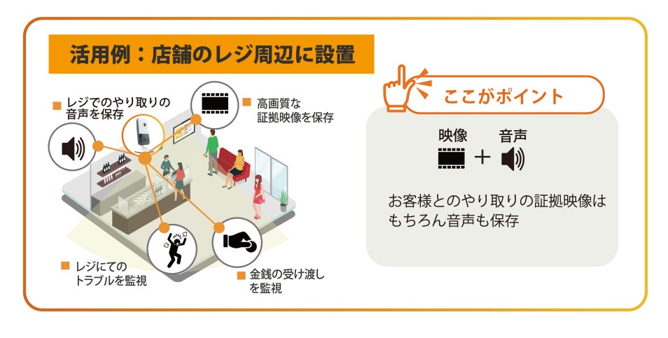 本サービスで使用するカメラは簡易的に設置できるだけではなく、カスハラ対策に必要な機能を備えています。