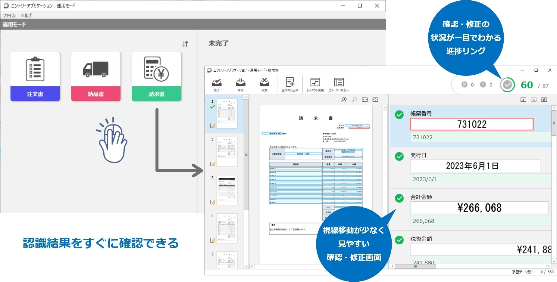 シンプルな操作で誰でも簡単に使い始めることができる「エントリーアプリケーション」に、「DynaEye」シリーズ開発にて培ってきたAI-OCR技術を新たに導入し、取引書類の認識精度を大幅に向上しました。