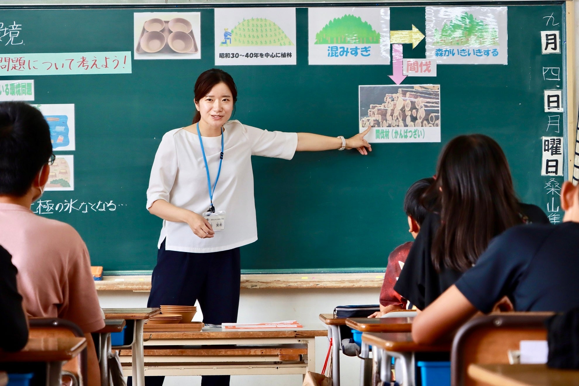 9月4日、報道陣に公開された「環境教育授業」では、市立惇明小学校6年生が、市内・国内の森林の荒廃状況や土砂崩れなどの災害を防ぐ「間伐」の大切さ、また間伐材の地元産ヒノキが給食食器になるまでの過程やそれによってプラスチック削減につながることを学びました。新食器がお披露目されると「かっこいい!」と拍手が起こり、小学生たちは実際に食器を手にとり「軽い」「木のにおいがする」「色があたたかい」などと感想を述べ、SDGsの視点で自分が今後できることについて話し合いました。