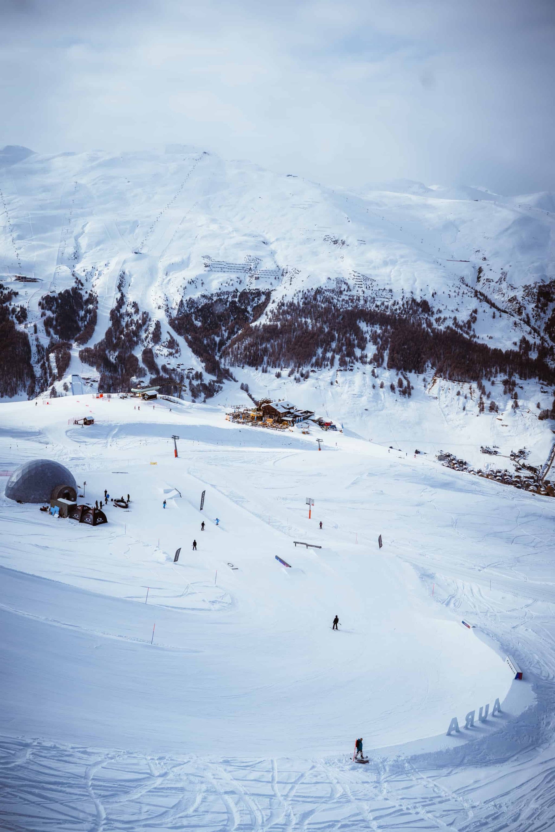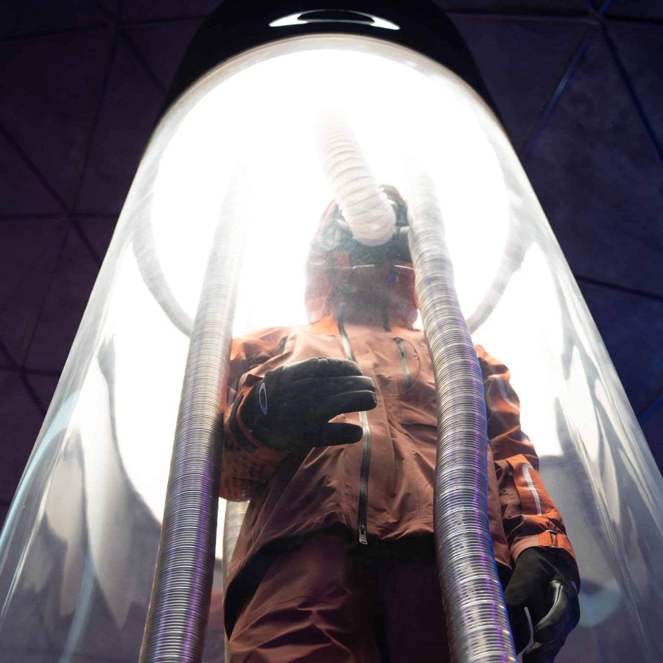 Flowparkの麓には、Oakley Outpostがリヴィーニョ山に姿を現しました。ブルータリズム様式を取り入れたドーム型の建物は、オークリーのDNAを具現化したものであり、そこは、過去、現在、そして未来が交差し溶け合う没入型の空間です。バンカーの扉をくぐると、インダストリアルな構造と有機的な要素が融合したオークリーのオアシスが広がります。そこでは、過去・現在・未来にわたるオークリーの歴史的遺産が、スノーパフォーマンスにおけるブランドの進化を辿る文化的オブジェとして展示されています。