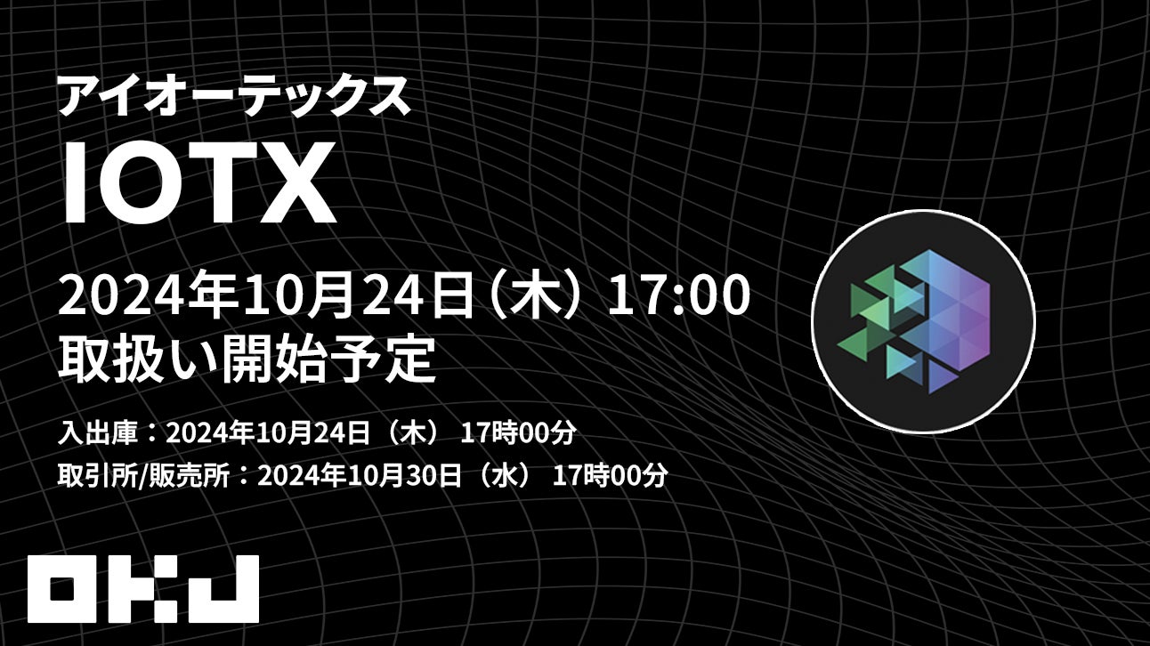 OKJでは、『アイオーテックス(IOTX)』を、2024年10月24日(木)に取扱い開始することをお知らせいたします。これにより、OKJは、43種類の暗号資産を取扱うことになります。また、2024年10月23日時点で、アイオーテックス(IOTX)の取扱いは国内初となります。(※自社調べ)
