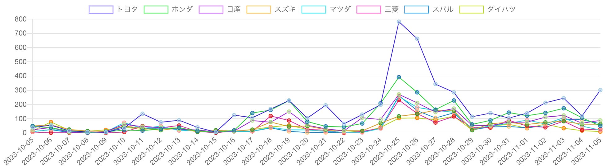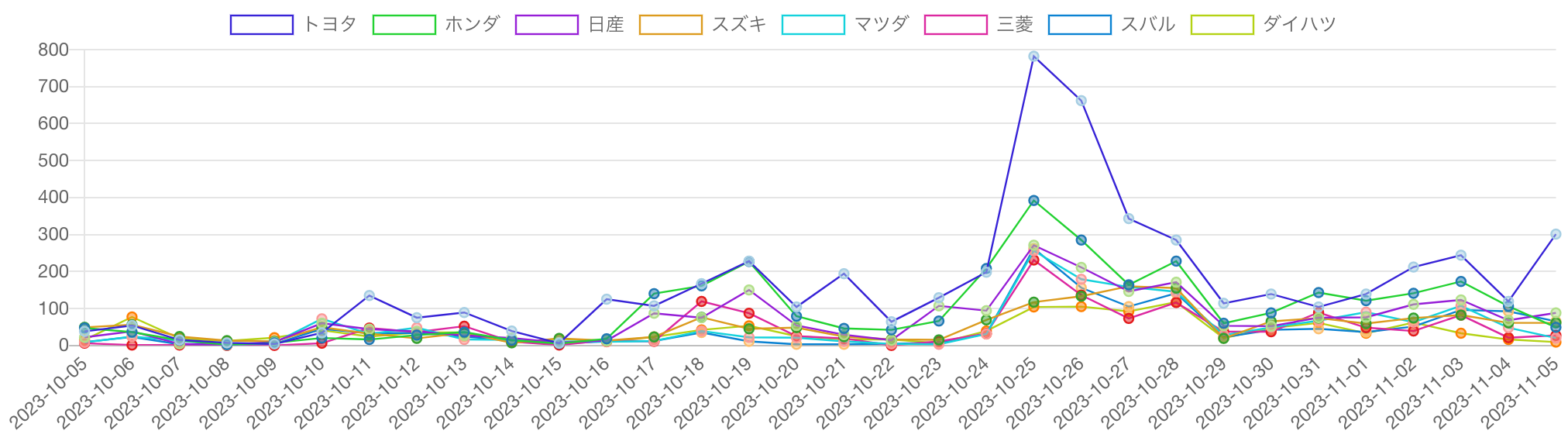 25日のプレスデーに書かれた記事が群を抜いて多くありました。これは具体的な展示内容以外にも、ジャパンモビリティショー自体を説明する記事で出展メーカーの代表として記載されるケースが多いことが影響しています。