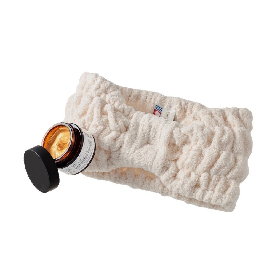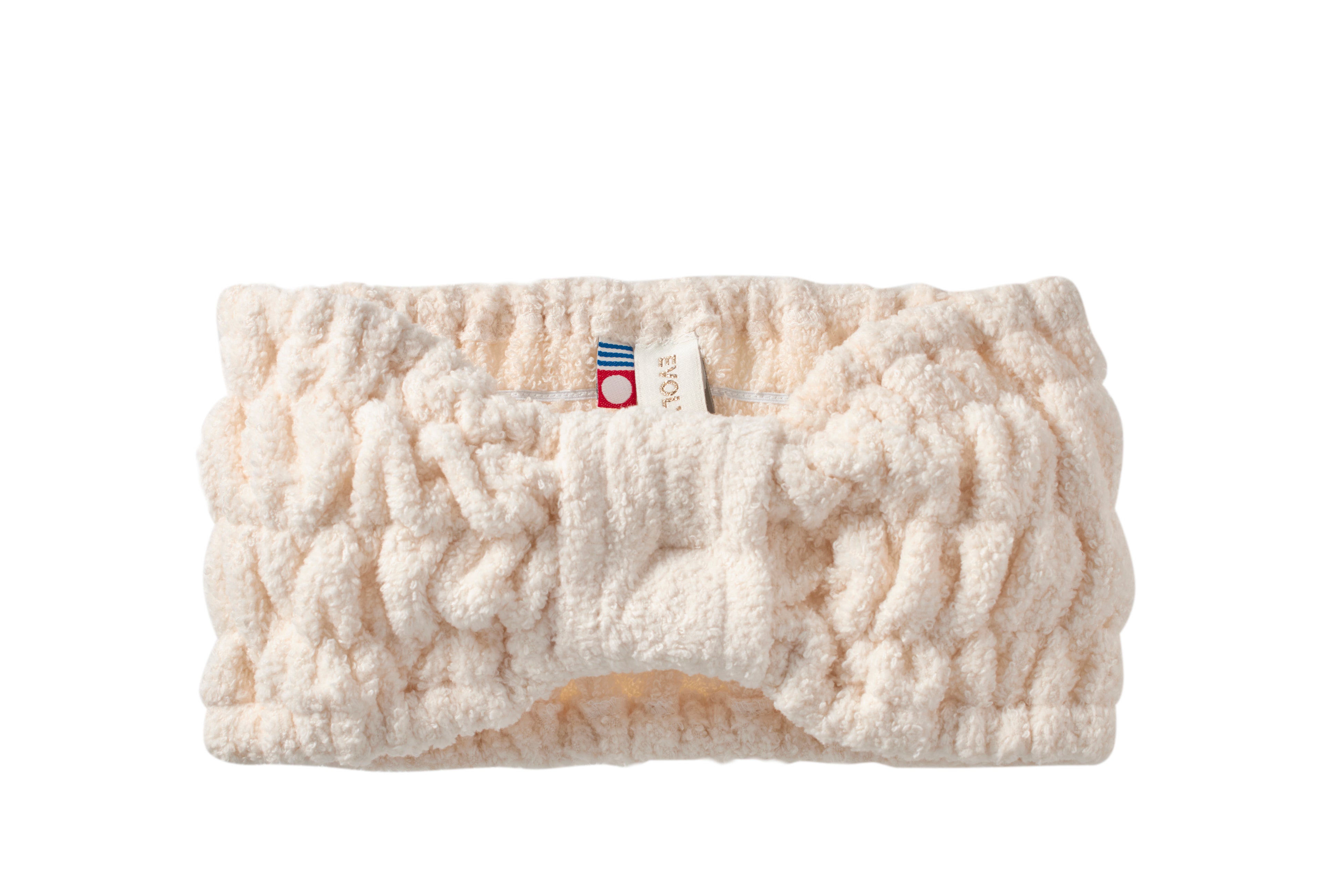 お手入れタイムがさらに贅沢な時間になるヘアバンド。バニラのカラーが柔らかな雰囲気を醸します。耳辺りまですっぽり隠れる幅広で、厚地でしっかりとした今治タオル製です。内側には、今治タオルタグの隣に、ゴールド刺繍のEVOLVE織りネーム付き。