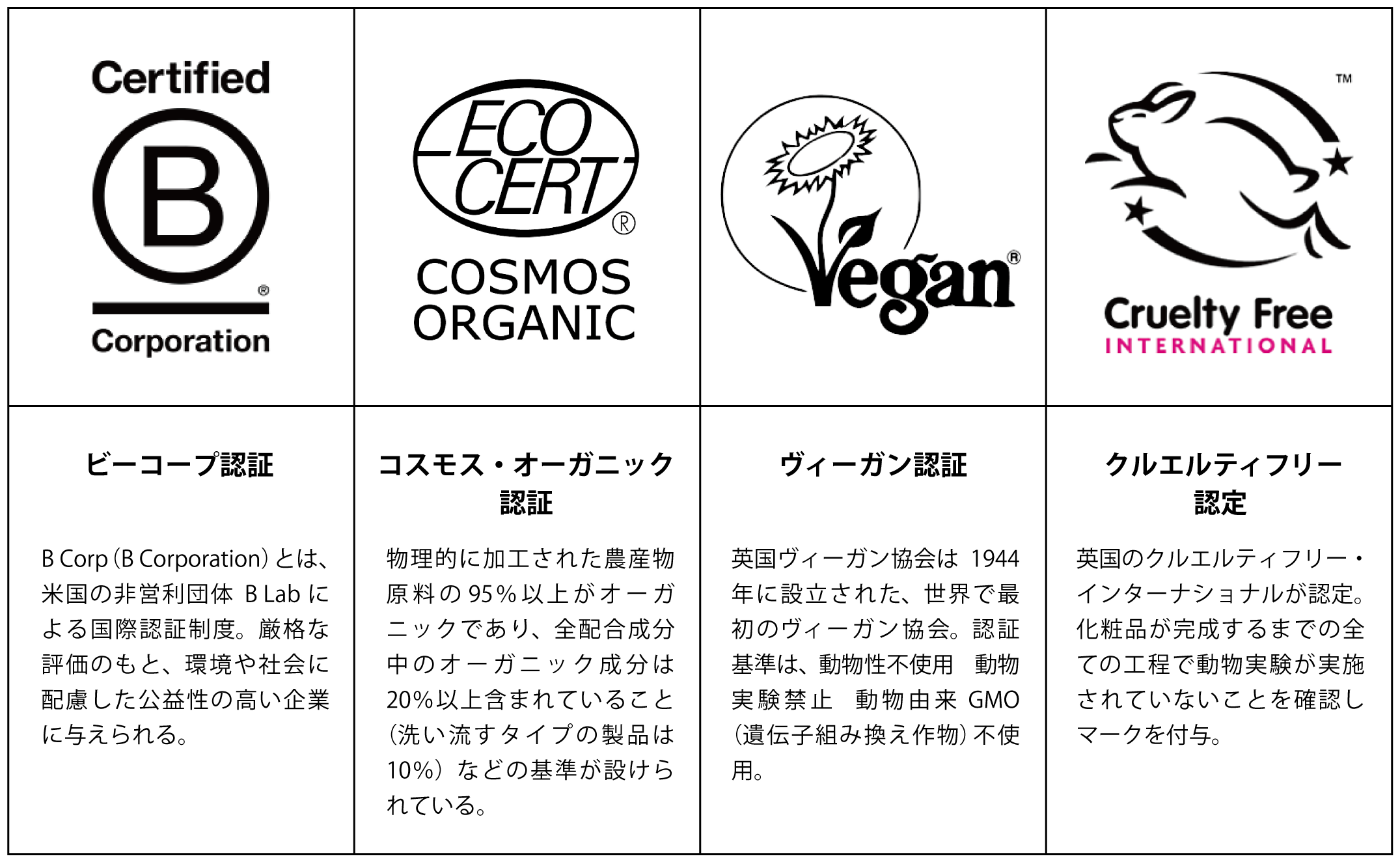 『EVOLVE』はB Corp認証、ヴィーガン認証、クルエルティフリー認定の3つの認証の他、ほとんどの商品でエコサートCOSMOS認証を取得しています。その他にもパームオイル使用の削減や植林活動の推進、ココナッツやサトウキビなど食品業界からアップサイクルされた原料の採用、フェアトレード原料の使用など幅広い分野でクリーンビューティーを推進しています。