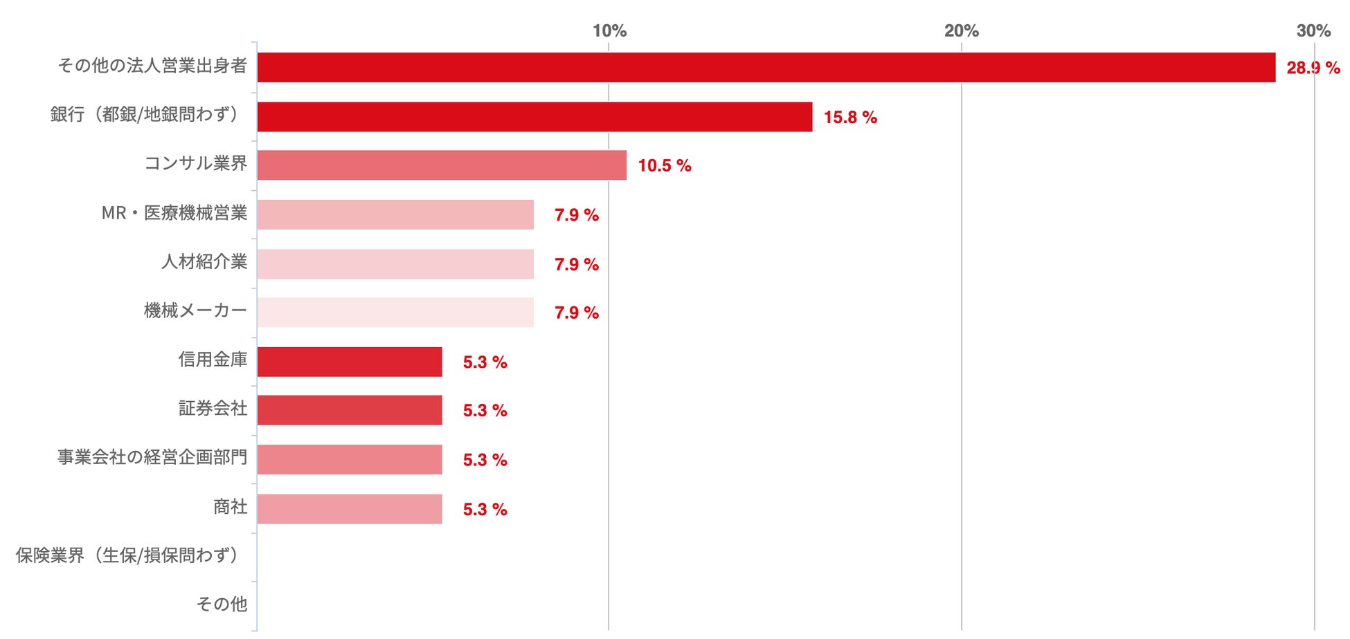 アンケートによれば、M&A業界に転職した回答者の前職は多岐にわたるが、特に目立つのは「その他の法人営業出身者(28.9%)」や「銀行(15.8%)」、「コンサル業界(10.5%)」の出身者である。