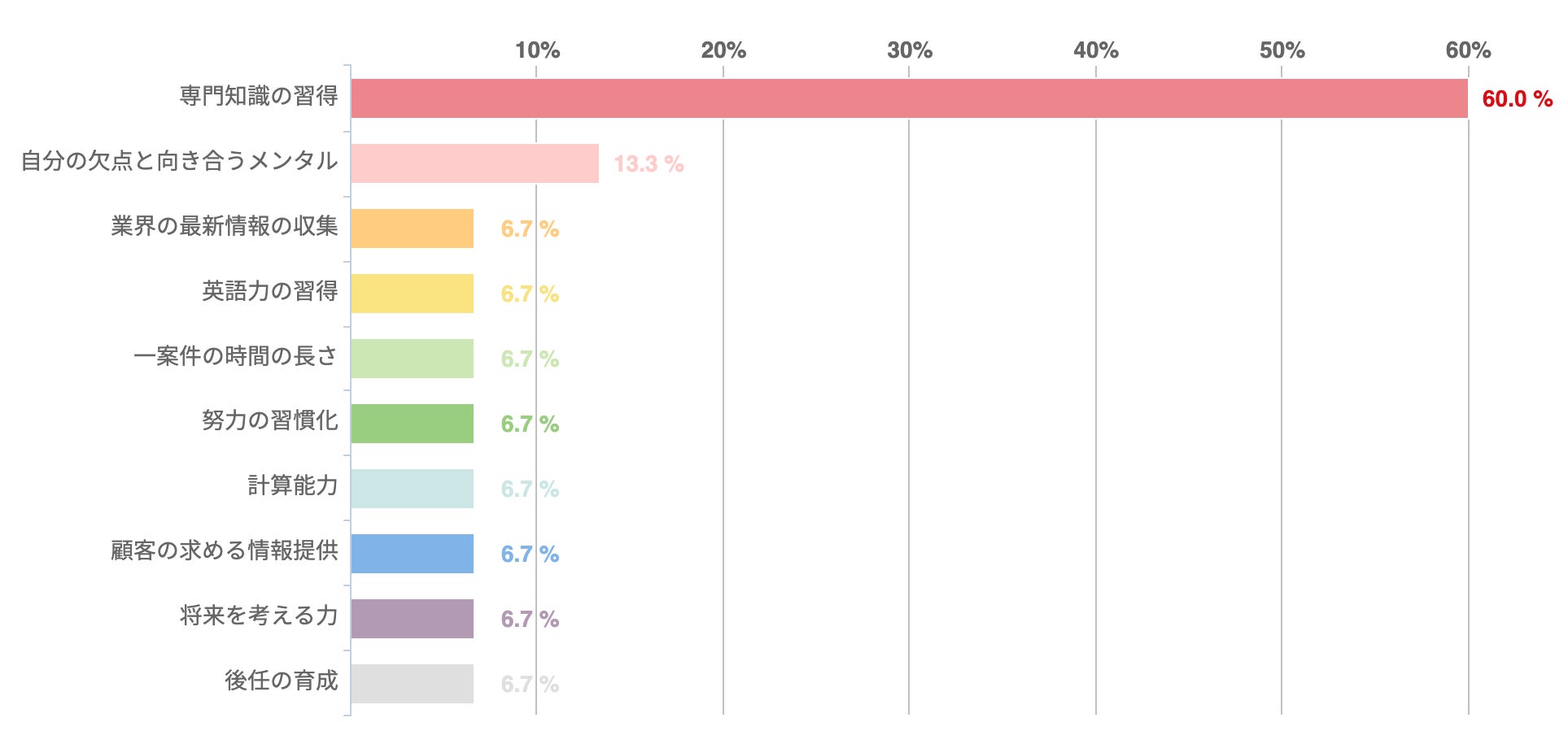 また、「英語力」や「努力を毎日続けられるよう習慣化すること」、「日本の将来について考えて提案できる力」といった点も一定数(6.7%)挙げられており、M&A業界で多様なスキルが求められていることが読み取れる。