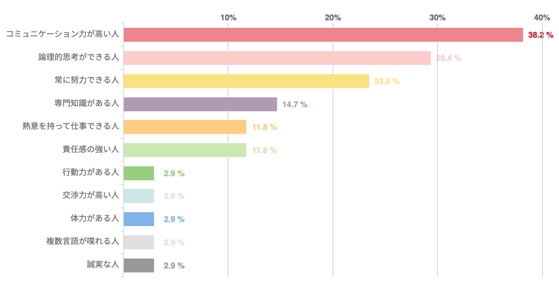 アンケートによれば、M&A業界への転職者は「コミュニケーション能力が高い人(38.2%)」と「論理的思考力を持つ人(29.4%)」が主に求められていると語っている。特に、「クライアントやチームメンバーとの円滑な意思疎通を図りながら、複雑な案件を解決するための戦略を練ることができる人」が重視されるという意見が目立った。