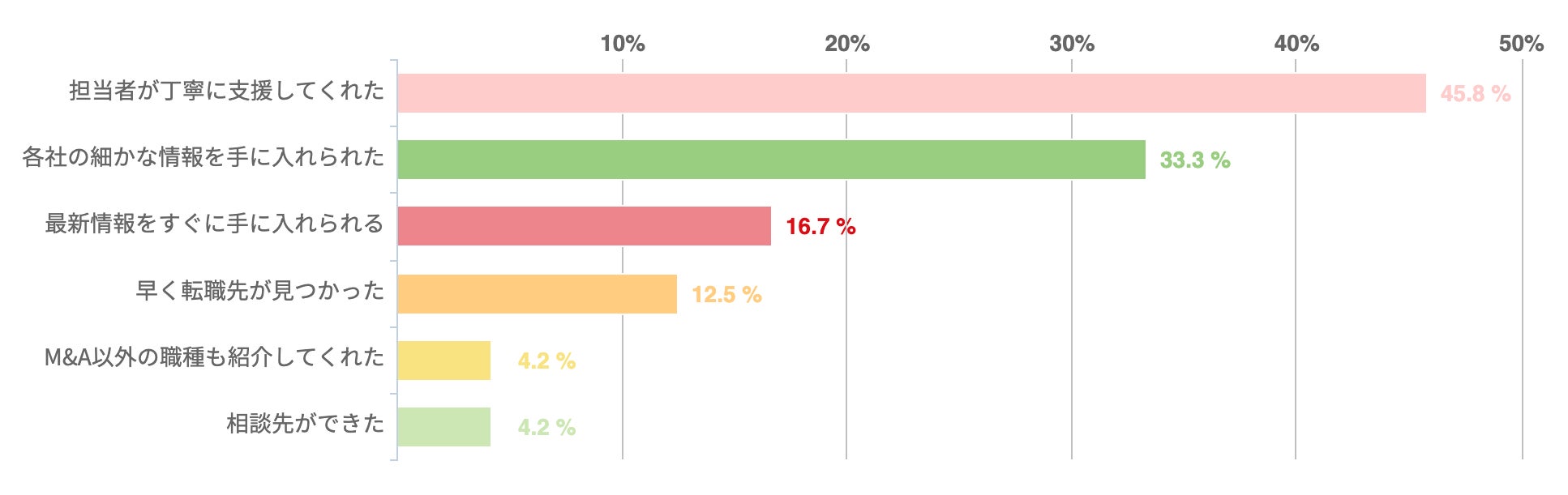 アンケートによれば、M&A業界への転職において、エージェントを利用してよかった点としては、「担当者が丁寧に支援してくれた」が45.8%で最も多かった。