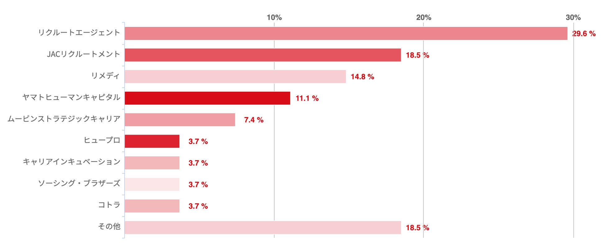 アンケートによれば、M&A業界への転職活動においてエージェントを利用した回答者が最も多く利用していたのは「リクルートエージェント(29.6%)」であった。