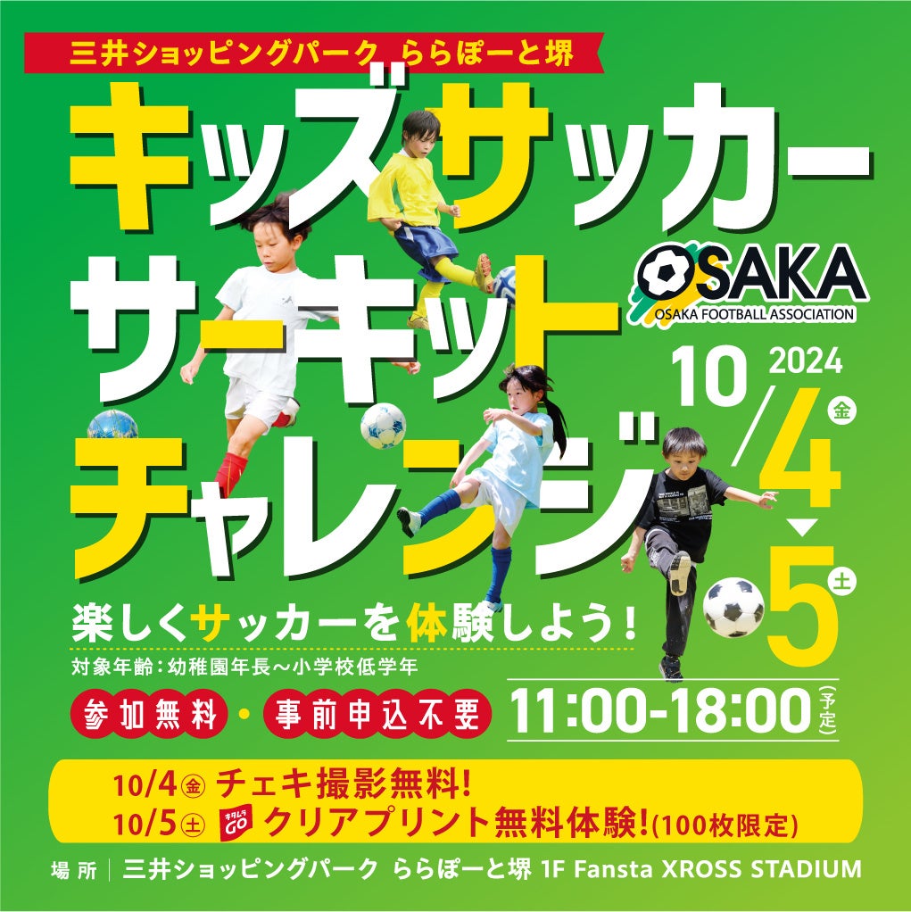 TSP太陽株式会社(本社:東京都目黒区、代表取締役社長 池澤 嘉悟、以下「当社」)は、令和6年10月4日(金)〜5日(土)に、三井ショッピングパーク ららぽーと堺にて、大阪府サッカー協会の協力のもと、『キッズサッカーサーキットチャレンジ』を開催します。