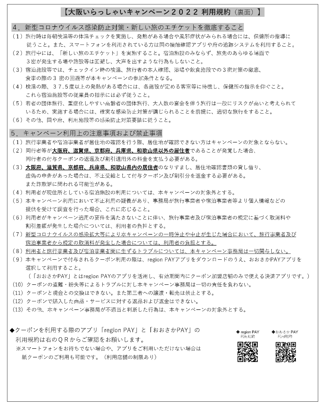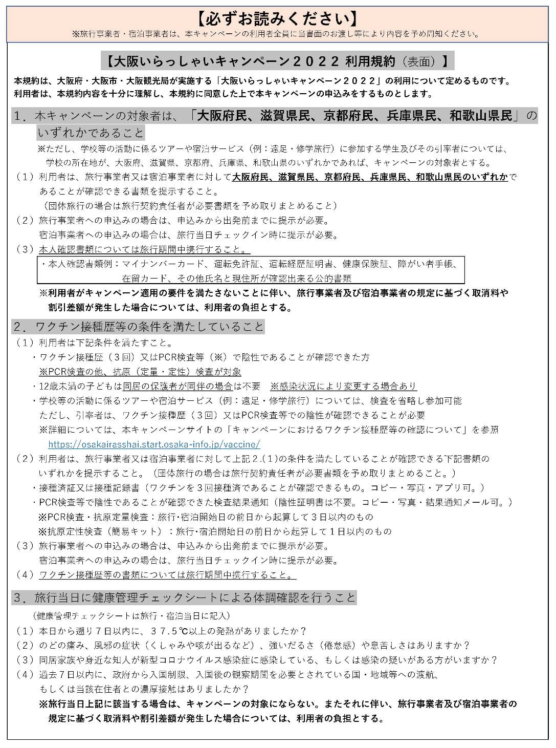 「大阪いらっしゃいキャンペーン」のご利用にあたっては、次の内容を必ず守っていただき、安全・安心なご旅行をお願いします。お約束、ご協力いただけない場合は、「大阪いらっしゃいキャンペーン」をご利用いただけません。 また、不正な手段などによりご利用された場合は、割引支援金の返還を請求することがあります。