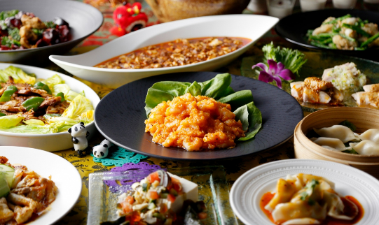 「海老のチリソース煮」や「⿇婆⾖腐」、「⿇辣湯」など唐⾟⼦・⼭椒・⾃家製ラー油をきかせた本格的な味わいが楽しめる四川料理と、⾒た⽬も鮮やかな「コブサラダ」や「ビーフストロガノフ」などCOOKAの洋食メニューが饗宴!ワゴンサービスでご提供する「四川風水餃子」もぜひお楽しみください。