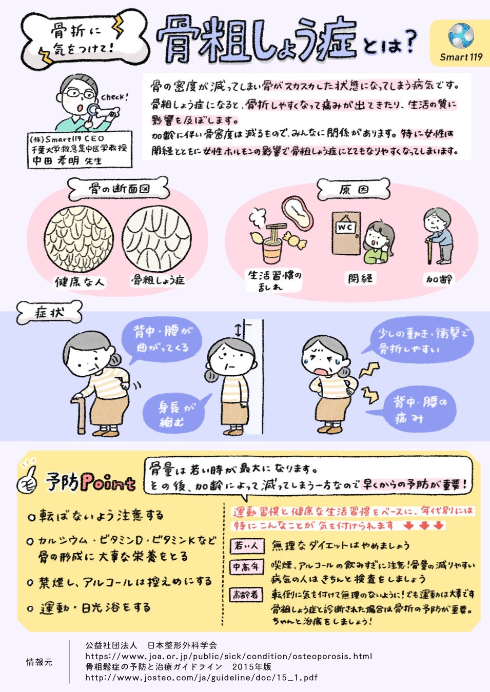 千葉大学発医療スタートアップ企業である株式会社Smart119(本社:千葉県千葉市、代表取締役社長/CEO:中田孝明)は、「骨粗しょう症」についてのイラストレーションを、本日一般公開しました。骨量は加齢によって減少していきますが、特に骨密度が低下する「骨粗しょう症」になると骨折をしやすくなるなど日常生活に影響を及ぼします。救急集中治療医の見地から、原因と症状、そして予防についてを、親しみやすいマンガで解説します。誰でも年齢とともに骨は弱くなります。若年時からの予防をして強い骨を維持しましょう。本資料は学校、企業、公共機関、町内会等で自由に配布・利用していただくことが可能です。