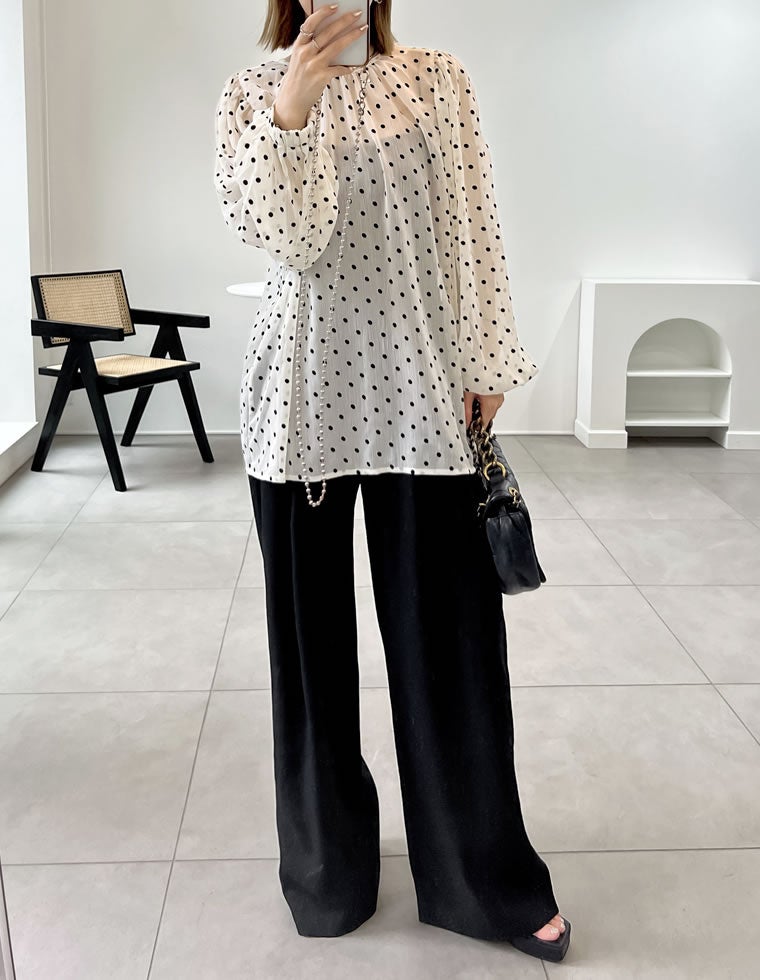 2WAY無地orフロッキードット柄シアー楊柳ボリュームスリーブブラウス