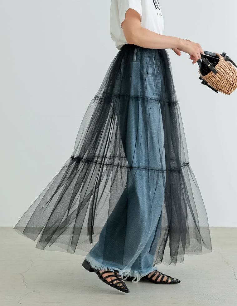 トレンドライクなスカートとしてはもちろん、チュールスカート単品で着用すれば、デニムとのレイヤードスタイルも楽しめます。