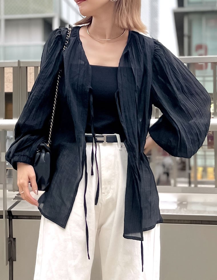 夏の羽織りとしても、秋のブラウスとしても活躍する「シアー楊柳ボリュームスリーブブラウス」