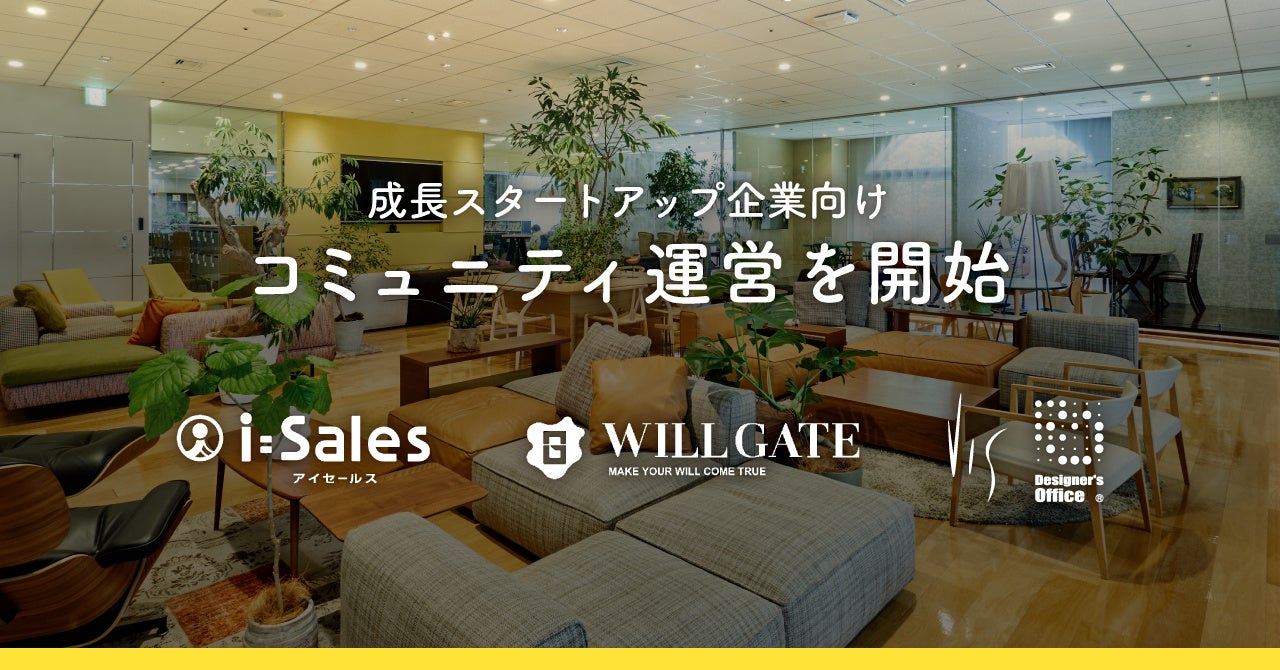 デザイナーズオフィスを手がけ、「はたらく」をデザインする株式会社ヴィス(本社:大阪市北区、代表取締役社長:金谷 智浩 以下ヴィス)は、成長するベンチャー・スタートアップ企業を支援するコミュニティ運営を、アイセールス株式会社(本社:東京都千代田区、代表取締役:田中 亮大 以下アイセールス)と株式会社ウィルゲート(本社:東京都港区、代表取締役:小島 梨揮 以下ウィルゲート)の2社とともに開始することをお知らせします。
