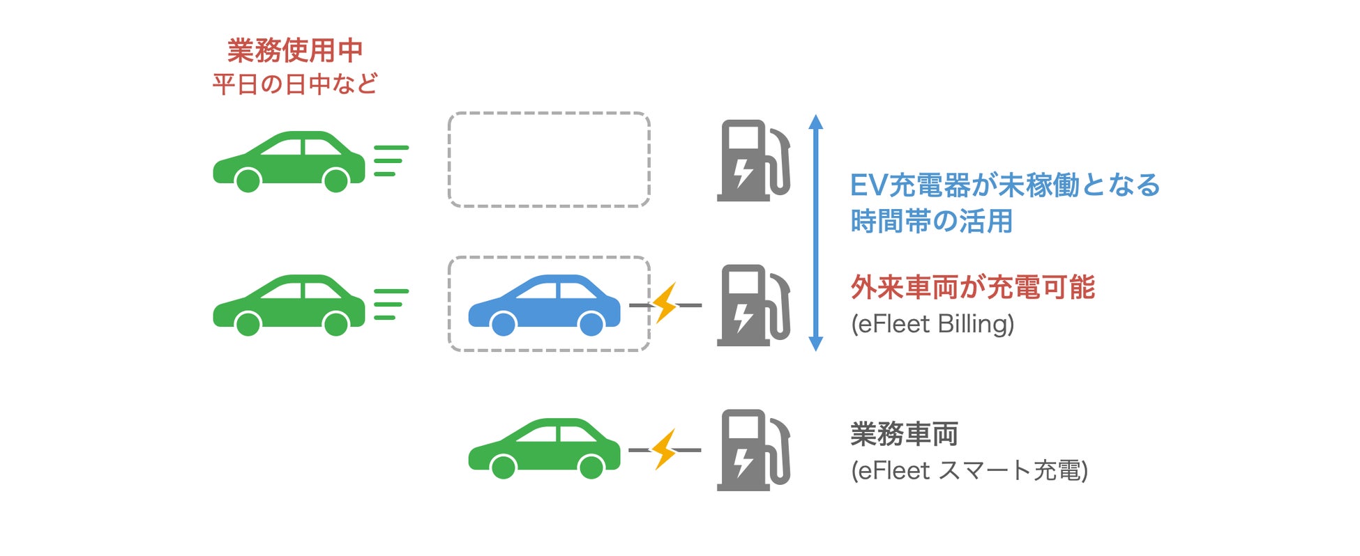 本実証では、「eFleet」による充電スケジュールに影響が出ない時間帯に、利用者ごとの充電量・充電時間を把握し、課金運用する「eFleet Billing」を組み合わせ、1台の充電器による2つのサービスの併用運用を検証しました。