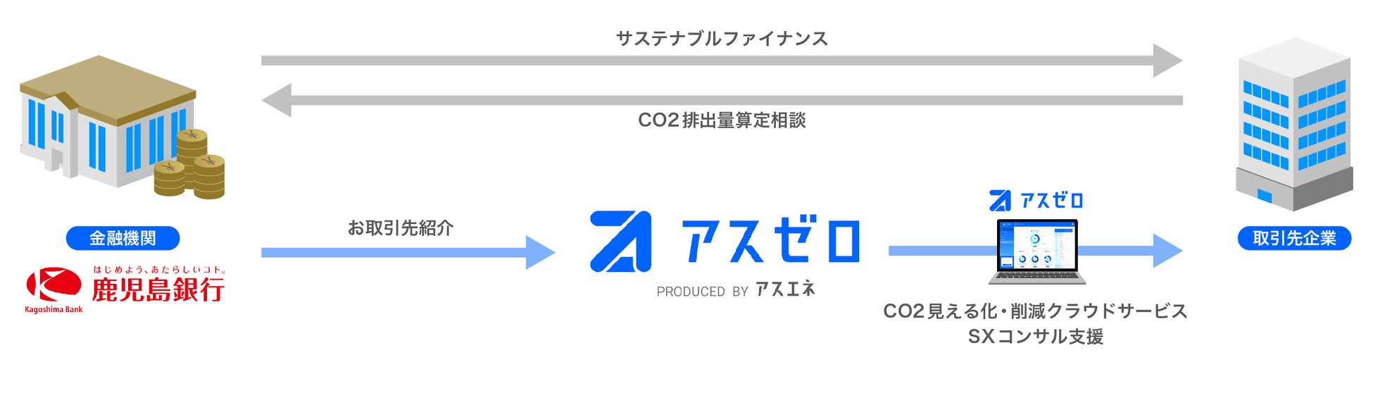 CO2排出量見える化・削減クラウドサービス「アスゼロ」を提供するアスエネ株式会社(本社:東京都港区、代表取締役CEO:西和田 浩平、以下「当社」)は、株式会社鹿児島銀行(本社:鹿児島県鹿児島市、取締役頭取:松山 澄寛、以下「鹿児島銀行」)と業務提携契約を締結しました。アスゼロの脱炭素ワンストップソリューションを通じて、鹿児島県にある企業の脱炭素経営を支援します。九州地方の地域金融機関との業務提携は初めての取り組みとなります。
