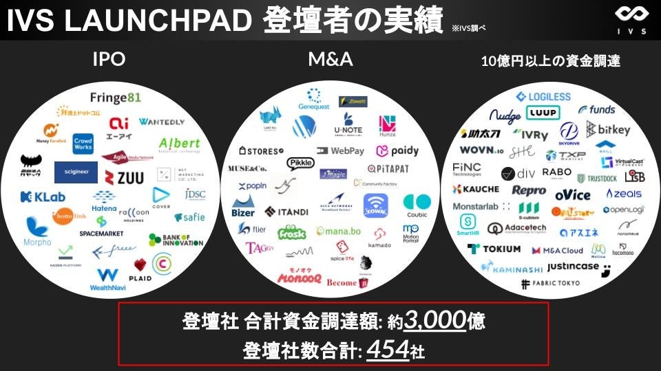 過去登壇者は450社を超え、60社以上がEXIT、10億円以上の資金調達を行い急成長を遂げている企業が35社以上あり、多くのスタートアップがIVS LAUNCHPADを発射台にして飛び立っていきました。