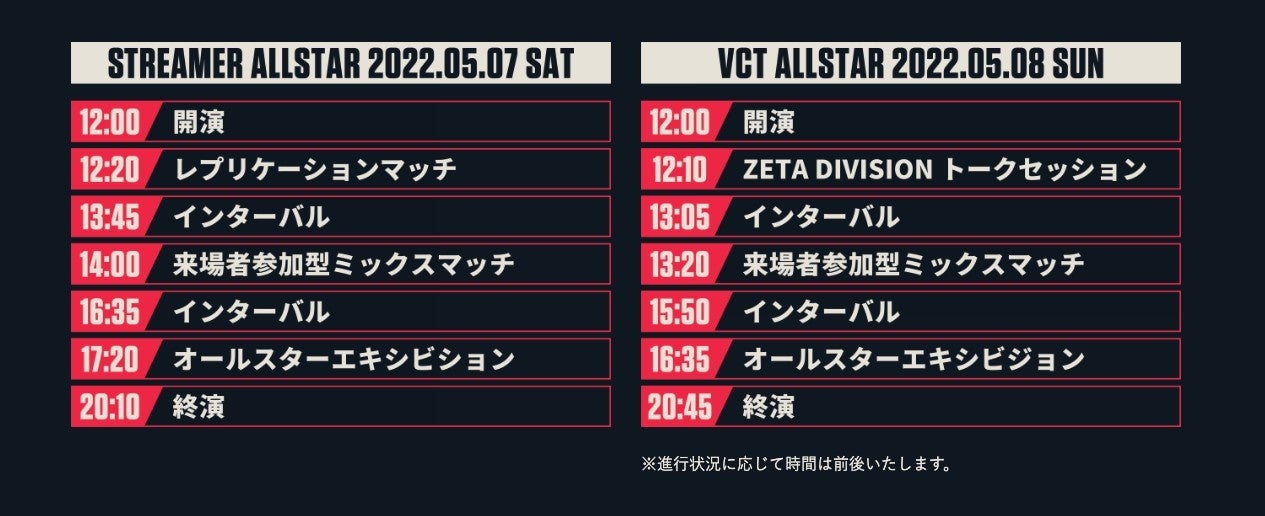 株式会社CyberZ、エイベックス・エンタテインメント株式会社、株式会社テレビ朝⽇が運営する国内最⼤級のeスポーツエンターテインメント「RAGE(レイジ)」は、タクティカルFPSゲーム『VALORANT』の有観客イベント「RAGE VALORANT 2022 Spring」のタイムスケジュールを発表します。DAY1、DAY2ともにここでしか見られないスペシャルエキシビションマッチを生で観戦することができます。また、豪華出演者と一緒にプレイすることができる来場者参戦型マッチも予定しています。DAY2ではあの2022 VALORANT Champions Tour Masters1にて世界3位になったZETA DIVISIONのトークセッションをご用意しております。アイスランドで快進撃を見せたチームの裏側や、ポイントとなった試合、今後の展望を語っていただきます。イベントの様子はYouTube、Twitchでも配信いたします。ゴールデンウィーク後半はぜひRAGE VALORANT 2022 Springをお楽しみください。