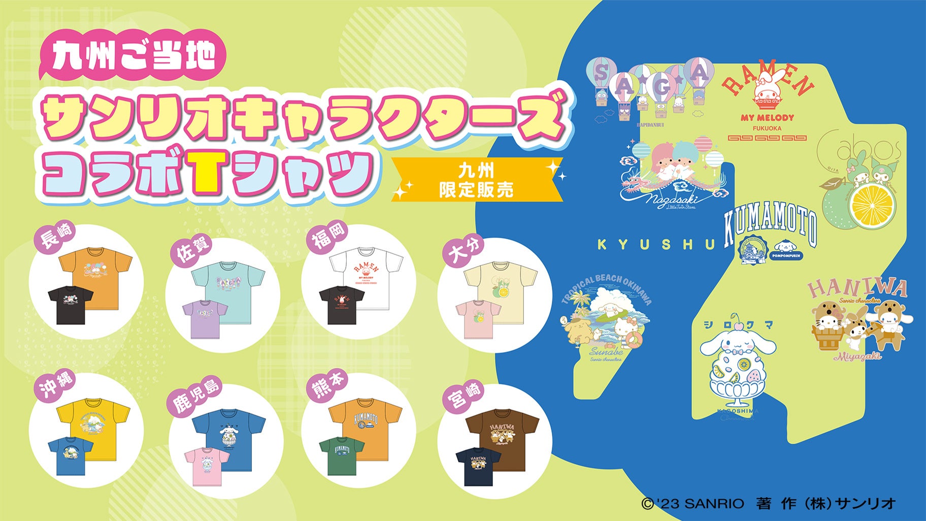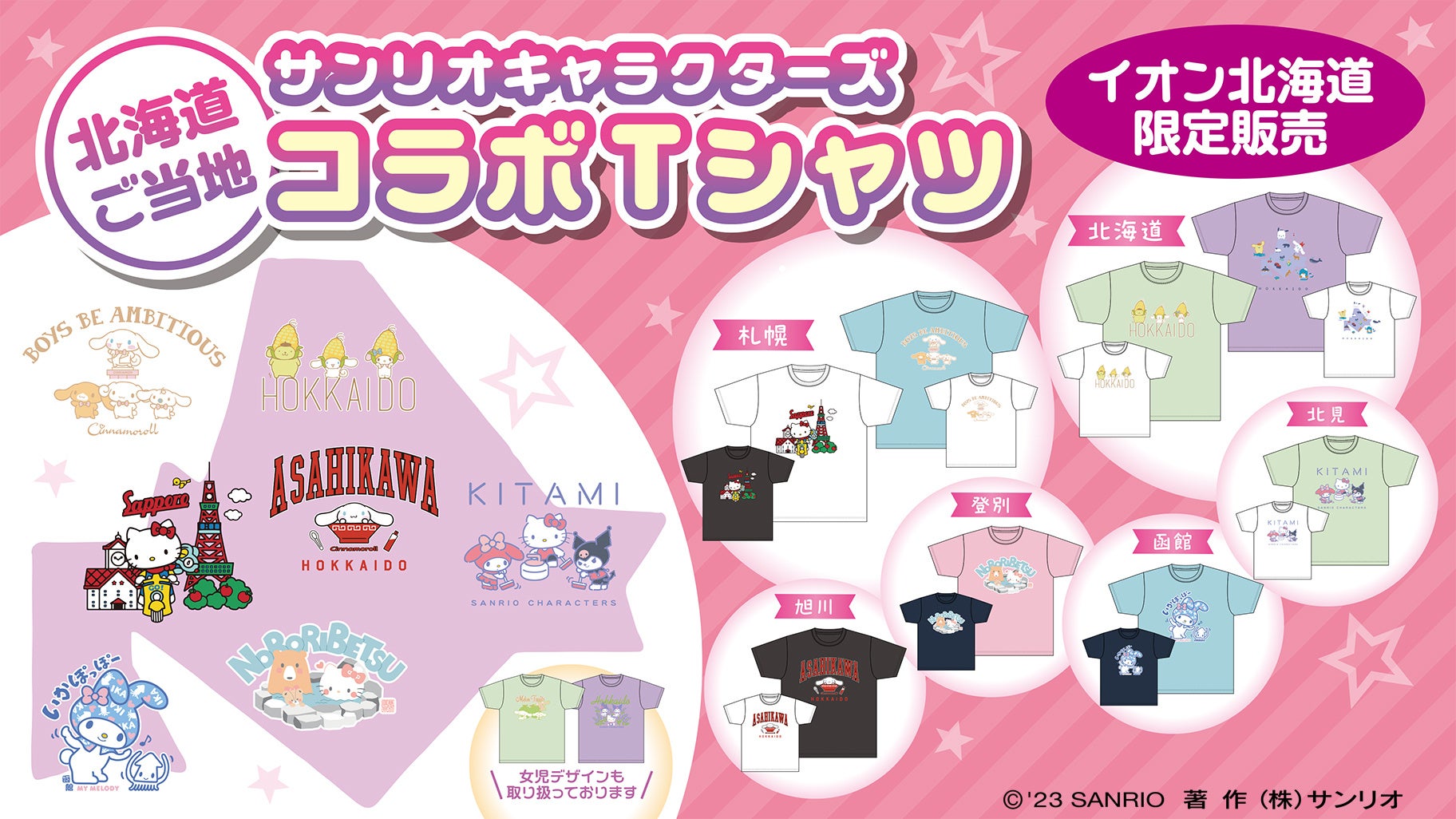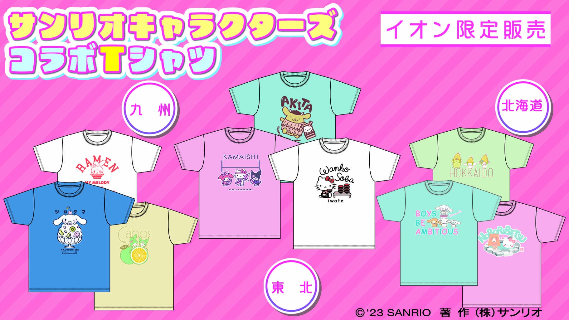 イオン限定・ご当地の名所や名産品とコラボした「北海道・東北・九州 サンリオキャラクターズ コラボTシャツ」