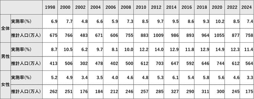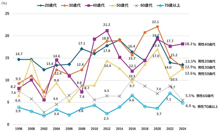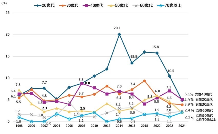 女性の2024年実施率は40歳代の5.1%が最も高く、20歳代4.9%、30歳代3.9%と続く(図3)。20歳代の実施率はほかの年代に比べ高い傾向が続いていたが、2020年から3分の1程度へと大きく減少し、2024年は40歳代を下回った。30歳代の実施率も減少傾向が継続した。一方、女性で2022年より実施率が増加したのは60歳代、70歳以上であった。