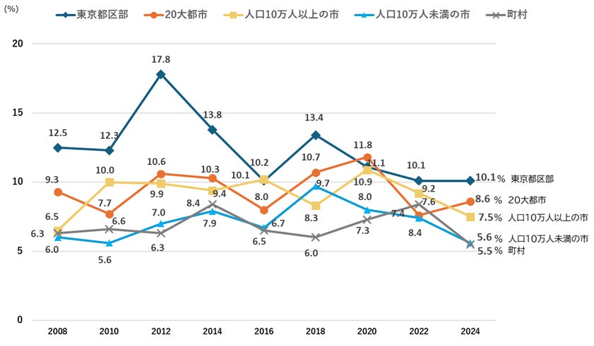 ● 都市規模別:東京都区部が10.1%で最も高く、20大都市の8.6%のみ前回調査から増加