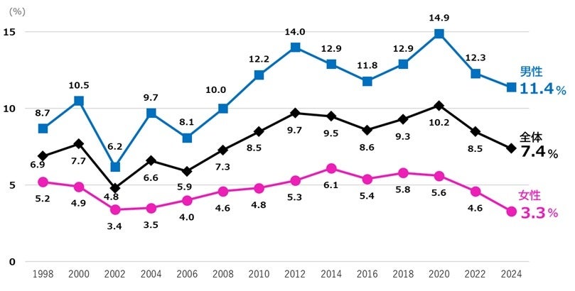 実施率:2020年:10.2% → 2022年8.5% → 2024年7.4%