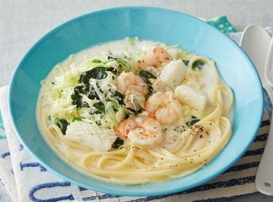 レンジで作るキャベツとシーフードの夜食スープパスタ