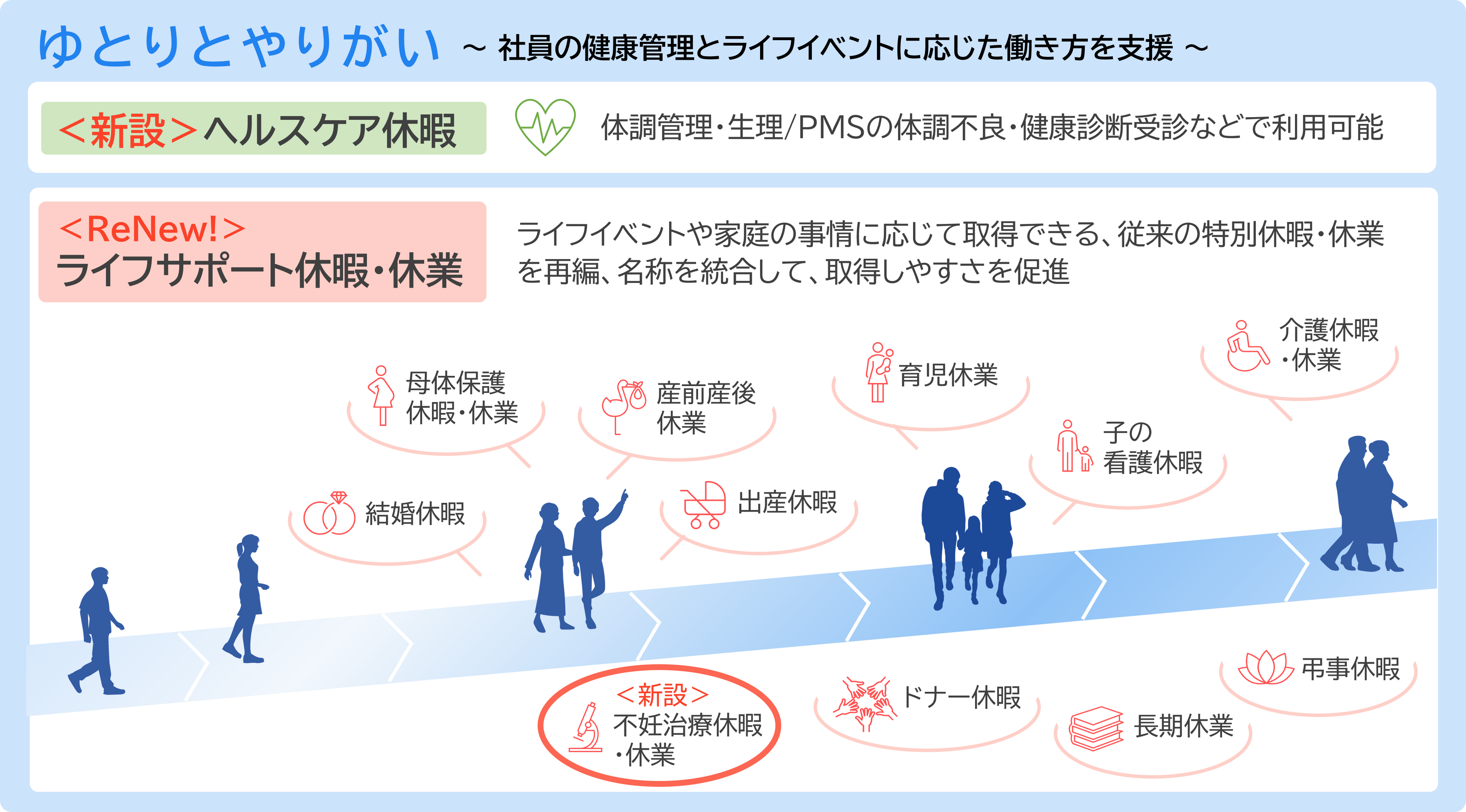 女性の負担が大きいとされる不妊治療と仕事の両立支援として新設します。不妊治療休暇は年12日まで(30分単位で取得可能)、不妊治療休業は最長1年間取得を可能とし、次世代育成に取り組む社員を支援、安心して働き続けられる環境を整備します。