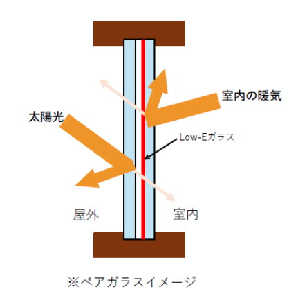 ペアガラスはガラスが二重の構造で、二枚のガラスの間には乾燥空気が封入された空間が存在し、この空間があることで断熱性能を高めたり、結露の防止になります。また、弊社ではLow-Eガラス(特殊な金属膜をコーディングしたガラス)を採用しており、室内の暖かさや涼しさを外に逃がさない断熱性能と、屋外からの太陽の熱を室内に取り組み室内の暖かさを保つ効果があります。