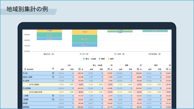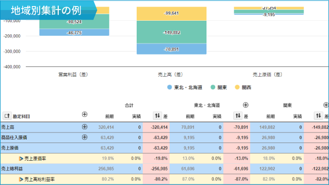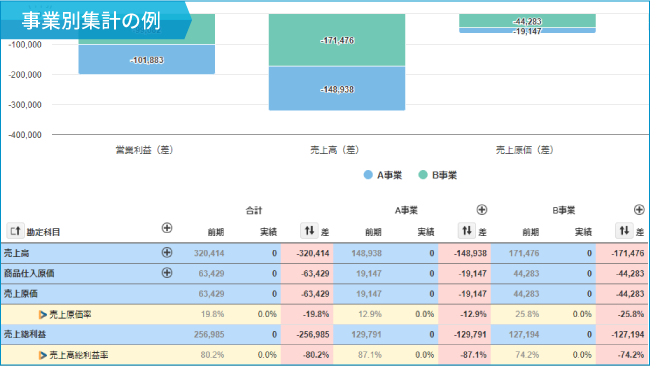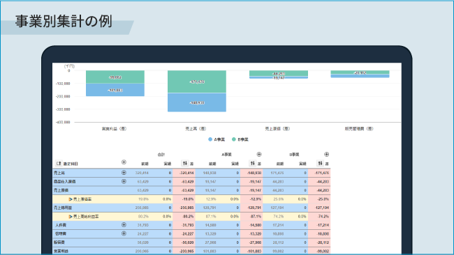 設定したタグ別に、損益の集計が行われ、全社>事業・地域>特定部門と深堀をしながら、損益数値や経営指標の現状分析、計画との予実比較などが可能となります。