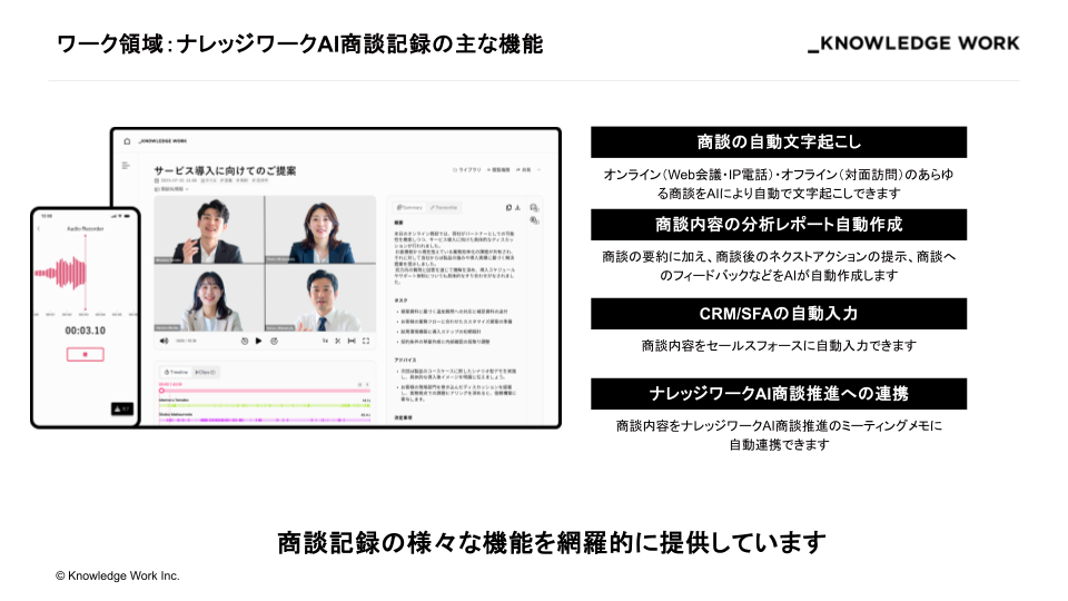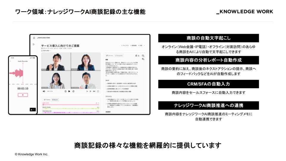 セールスイネーブルメントAI「ナレッジワーク」の主要プロダクトの一つである「ナレッジワークAI商談記録」は、オンライン商談に加え、対面でのオフライン商談も録音・録画し、AIが話者ごとに発言を可視化した文字起こしを実施します。加えて、商談内容の要約やタスク提示、フィードバックを生成し、CRM/SFAに自動入力。他のプロダクトである「ナレッジワークAI商談推進」とのシームレスな連携により、蓄積データの活用精度を高め、営業組織の生産性向上と営業担当者の成長実感・貢献実感の向上を実現します。