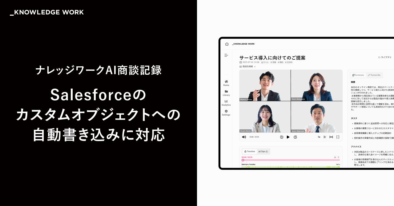 「LIFE WITH ENABLEMENT できる喜びが巡る日々を届ける」をミッションに掲げる株式会社ナレッジワーク(本社:東京都港区、CEO 麻野耕司)は、AIによる商談の記録・解析を行うプロダクト「ナレッジワークAI商談記録」において、Salesforceのカスタムオブジェクトへの自動書き込みに対応しました。これにより、企業が独自に構築しているSalesforceデータモデルに合わせて、商談内容・要約・行動情報を柔軟に蓄積でき、商談後業務の効率化とSalesforce上でのデータ活用を実現します。