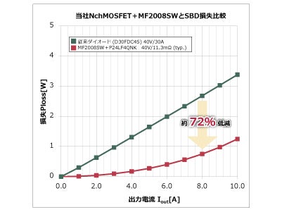 前モデル※1に順方向制御を取り入れることで、逆電流が流れる前段階でのGate停止を可能とし、軽負荷時でも逆電流を防止します。また、従来ダイオード※2と比較し電力の損失を約72%、温度上昇を約51%抑制することができ※3、これにより車載製品など逆接続・逆電流保護を必要とする機器の小型化、電力の低損失化に貢献します。