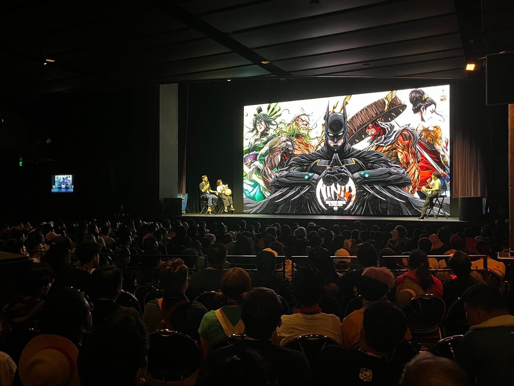 印を結ぶバットマンに加え、鷲の刺青に日本刀を手にしたワンダーウーマン、三度笠を被った飛脚風フラッシュ、ねじり鉢巻に三又槍の漁師風アクアマン、緑の提灯をもった花魁風グリーン・ランタンという衝撃ビジュアルが披露され、会場には歓声が溢れました。