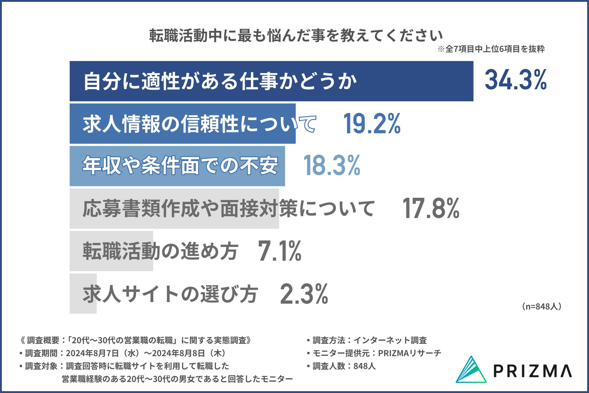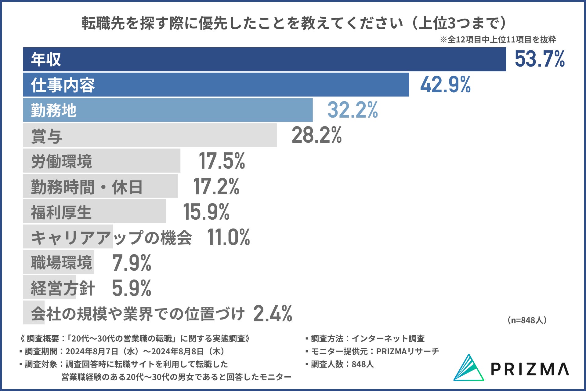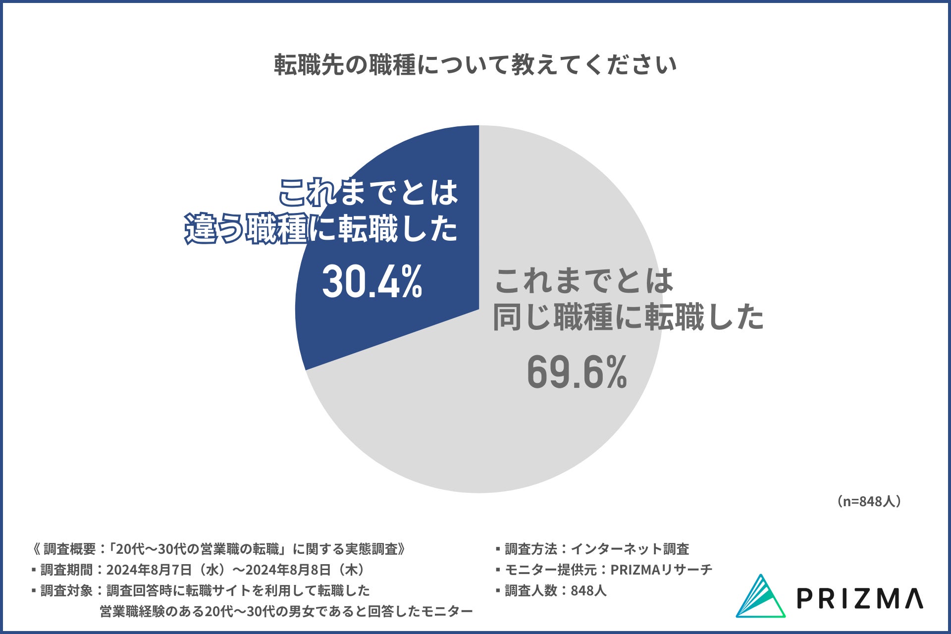 そこで今回、株式会社リンクアンドパートナーズ(https://www.prizma-link.com/press)は、転職サイトを利用して転職した営業職経験のある20代〜30代の男女848名を対象に、「20代~30代の営業職の転職」に関する調査を行いました。