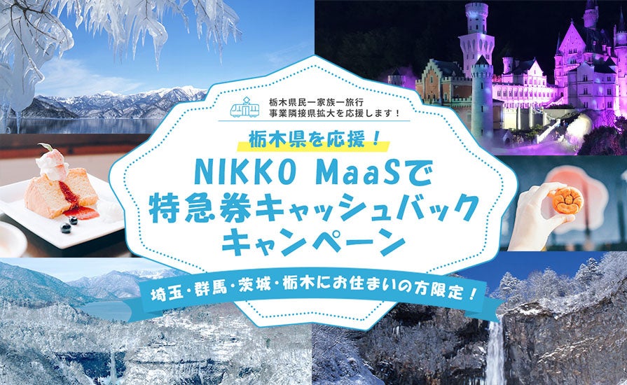 埼玉県・群馬県・茨城県・栃木県にお住まいの方で、日光地域へのお出かけに便利な「NIKKO MaaS」において、鉄道・バスがお得になる「デジタルフリーパス」を購入された方を対象に、埼玉県・群馬県から栃木県内の東武線各駅発着の特急料金を全額キャッシュバックします。