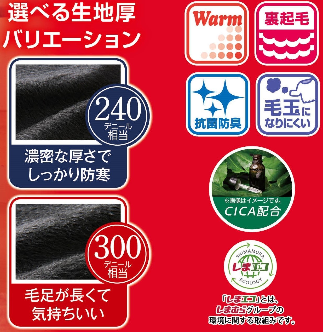 保温効果のある素材を使用しているほか、ツボクサから抽出したCICA成分を配合し、やわらかな風合いを実現しています。 今年は新たに60デニールを新規展開し、バリエーション豊富に取り揃えています。
