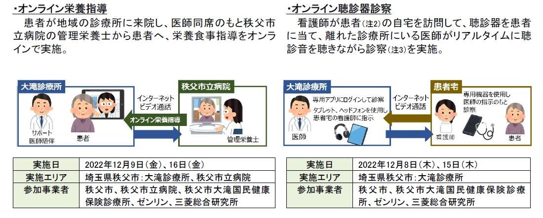 秩父市生活交通・物流融合推進協議会(会長:早稲田大学教授 小野田弘士/以下「本協議会」)(注1)は、埼玉県秩父市の大滝地域において、物流分野の取り組みとして「遠隔運用によるドローン配送」を、医療分野では「オンライン栄養指導」と「オンライン聴診器診察」の実証実験を実施しました。