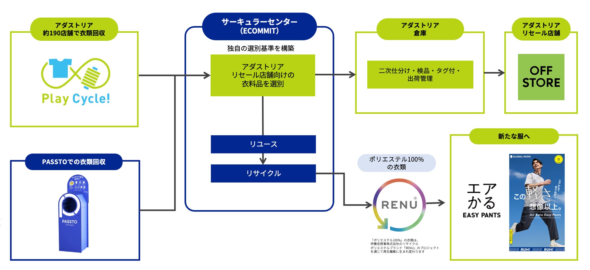 この度、ECOMMITは「Play fashion!」をミッションに掲げ”グッドコミュニティ共創カンパニー” を目指す株式会社アダストリア(本部:東京都渋谷区渋谷 2-21-1、代表取締役社長:木村 治、以下「アダストリア」)と、衣料品循環の新たなスキームを構築し、ファッションロスのない社会を目指します。