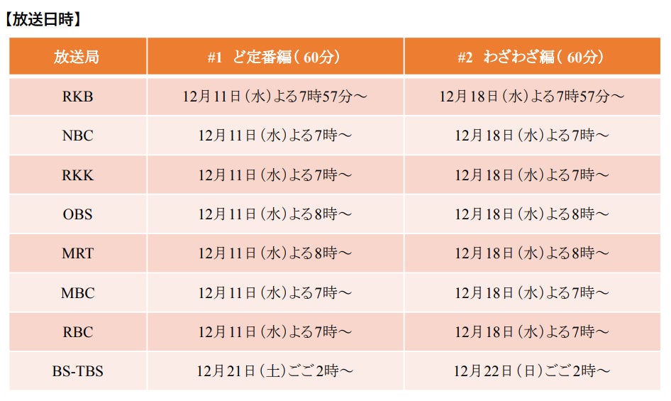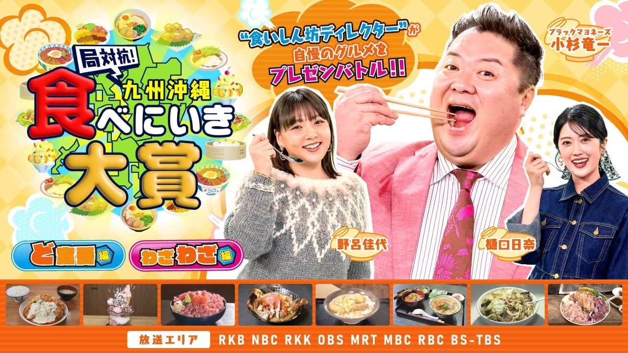 RKB毎日放送(放送エリア:福岡県・佐賀県)、長崎放送(長崎県)、熊本放送(熊本県)、大分放送(大分県)、 宮崎放送(宮崎県)、南日本放送(鹿児島県)、琉球放送(沖縄県)のTBS系九州沖縄7局とBS-TBSは、 2024年12月に「局対抗!九州沖縄食べにいき大賞」(ど定番編・わざわざ編 各60分)を共同制作、 放送します。