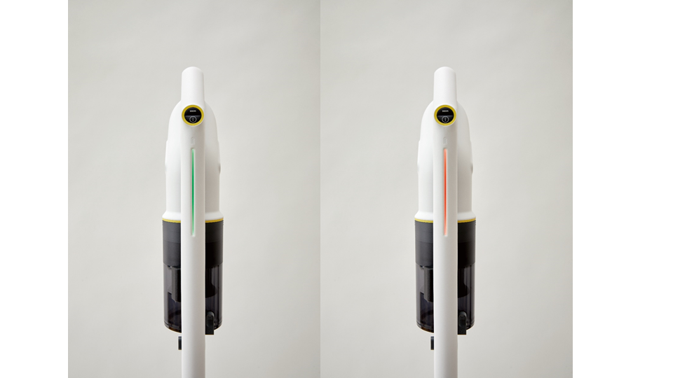バッテリー残量が20%を切るとランプが緑色から赤色に変わってお知らせ。同時にモードを自動で1段階落とし、より長い時間のお掃除をサポートします。