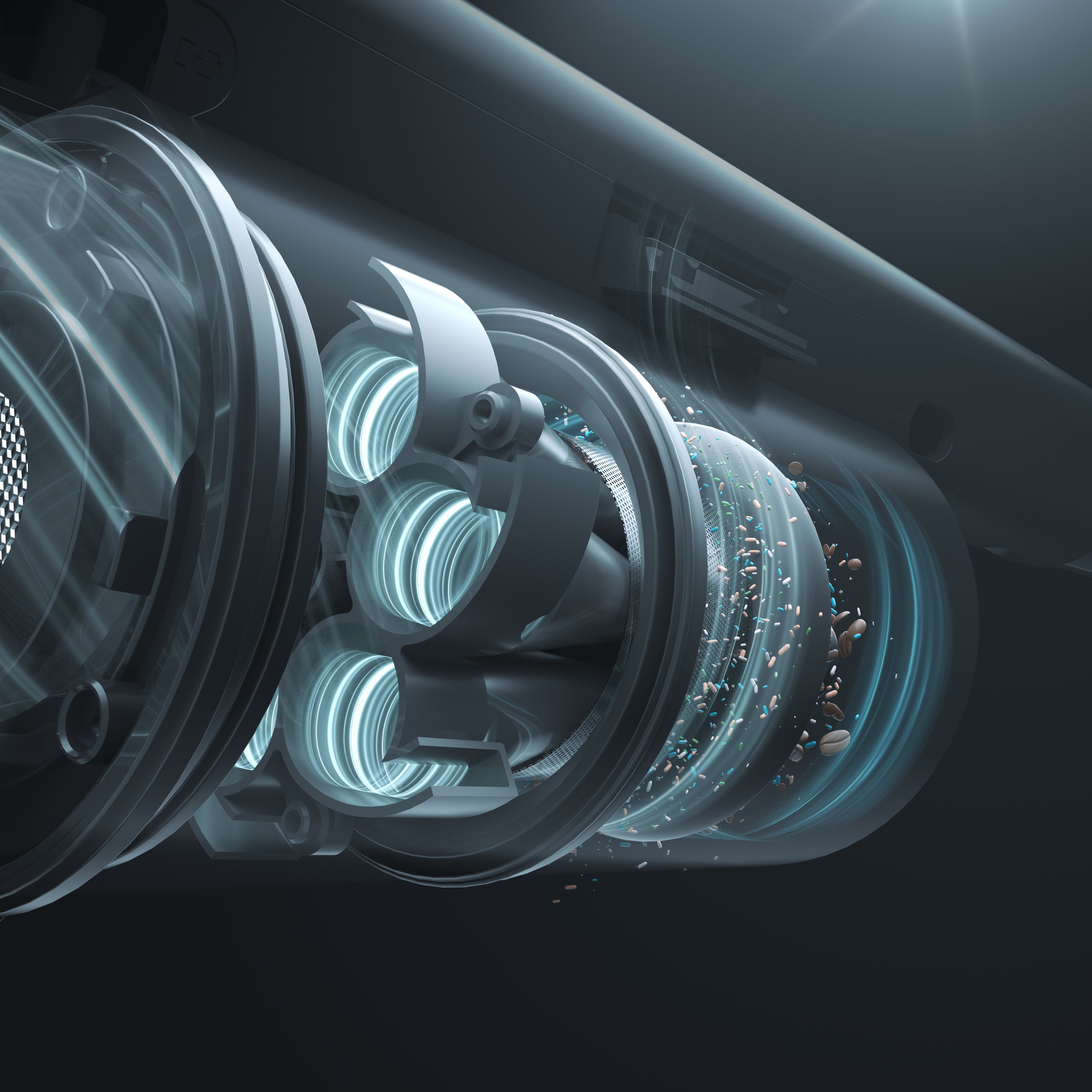 6つのサイクロンを搭載したマルチサイクロンシステムを採用し、パワフルな吸引力を実現。また、フィルターが詰まりにくいので、その吸引力が持続します。