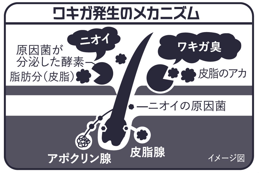 汗腺や毛穴の奥に潜む原因菌が分泌する悪玉酵素が皮脂をニオイ物質に分解することでワキガを発生させます。