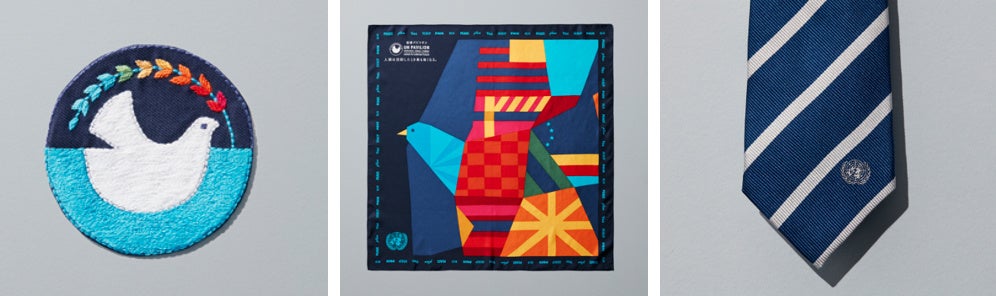 ウィメンズのコーディネートを華やかにするアクセントとして、平和の鳩をモチーフした国連オリジナルスカーフをリバイバルし、国連パビリオンロゴをあしらいました。上質なシルク100%の素材です。